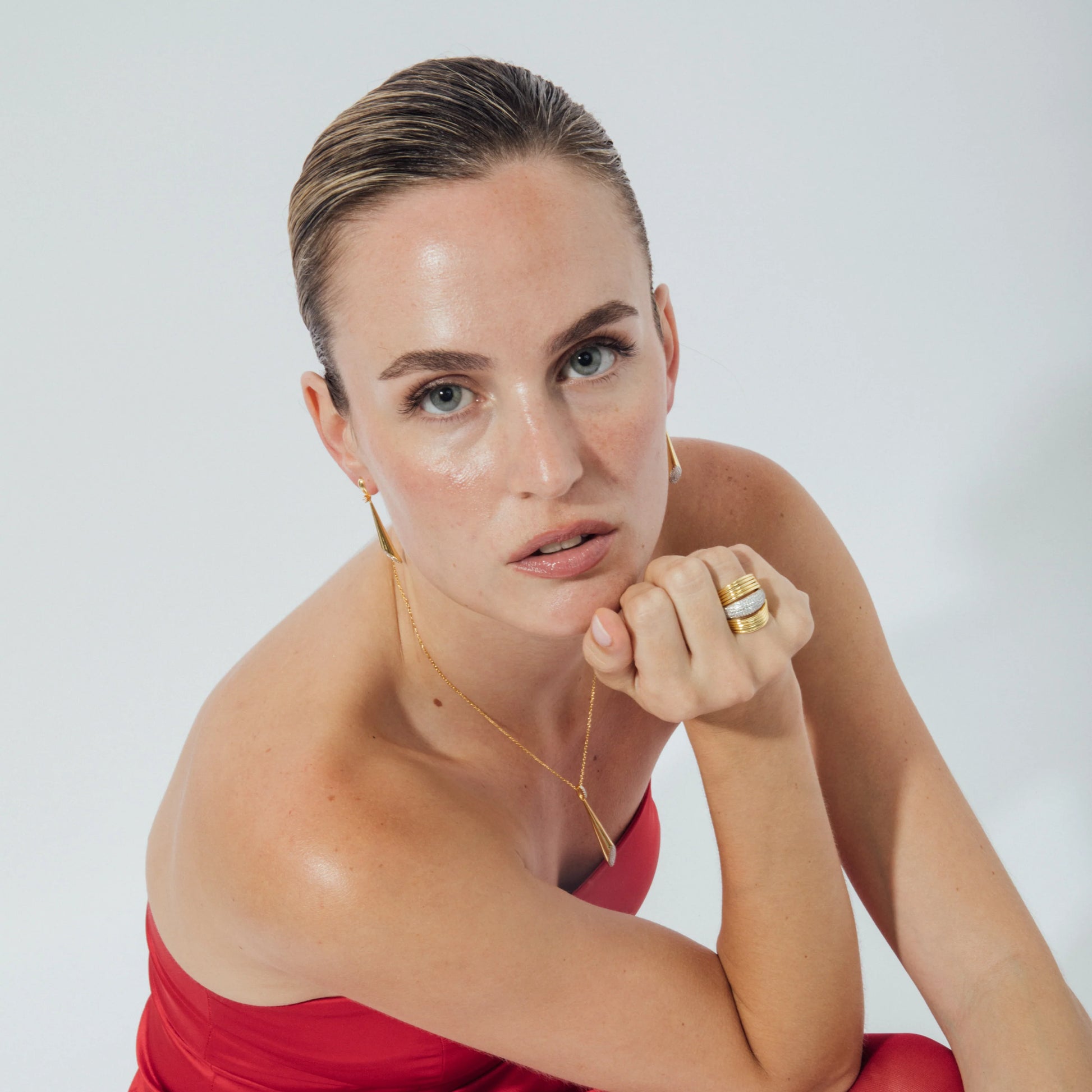 El anillo Hue destaca por su diseño moderno y sofisticado, ideal para aportar un toque de elegancia y brillo a cualquier look. Fabricado en plata de ley 925 con acabado en Oro Amarillo 18k, incorpora circonitas brillantes que reflejan la luz y realzan su estilo.