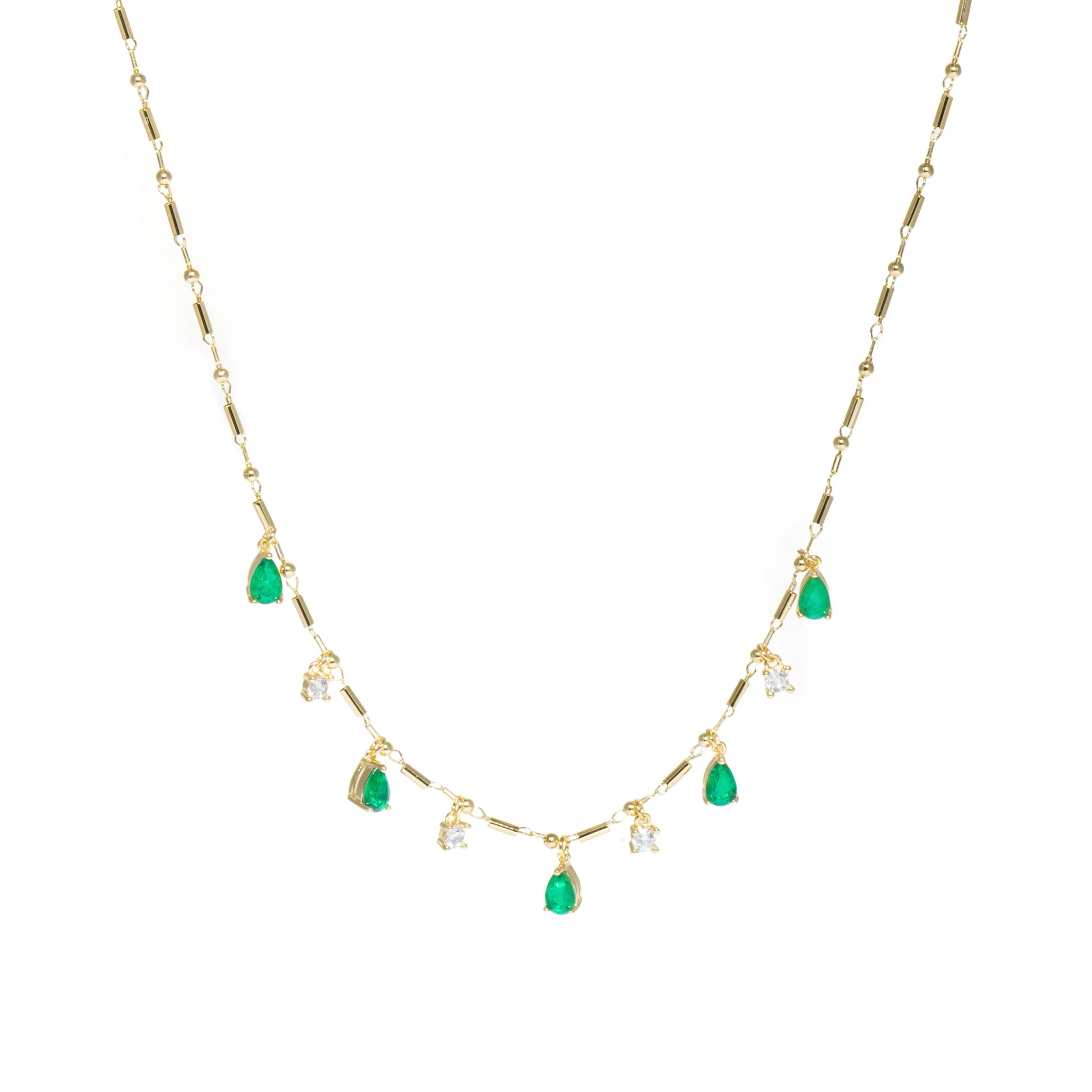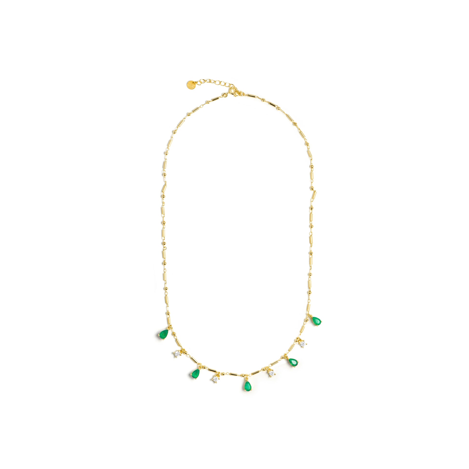 El collar Lakrom destaca por la frescura y luminosidad del cuarzo hidrotermal verde Paraiba, realzado con un elegante acabado en oro amarillo de 18k. Con cierre en Plata de Ley 925, es una pieza delicada y sofisticada, perfecta para aportar un toque de color y elegancia a cualquier look, tanto de día como de noche.